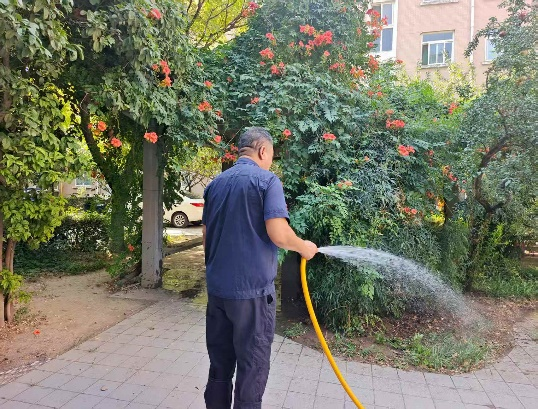 每天,管理处的绿化员工都顶着正午的烈日穿梭在小区里,汗水浸湿了衣衫也毫不在意。他们仔细检查每一处灌溉情况,及时调整浇水时间和水量,只为让花草树木在高温中挺过难关。正是这份坚守,让小区的绿意得以延续。