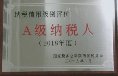 2018年 国家税务总局陕西省税务局“A级纳税人”。